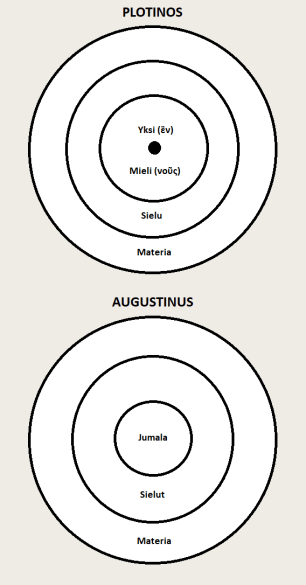 Kuten Plotinoksen, myös Augustinuksen ajattelua jäsentää olemisen hierarkia, jossa olemisen tasot menevät sisimmästä uloimpaan. Augustinuksella uloimpana on materiaalinen todellisuus. Keskitasolla ovat sielut, jotka Plotinoksesta poiketen ovat toisistaan erillisiä ja luotuja. Augustinuksen hierarkiassa korkeimpana on luonnollisesti Jumala. Augustinuksen korkein taso on yhdistelmä Plotinoksen ylintä ja toiseksi ylintä tasoa, sillä Augustinuksen hierarkiassa Jumalan mielessä sijaitsevat ikuiset ideat, jotka kuuluvat Plotinoksen kakkostasolle, sijaitsevat Jumalan itsensä tavoin korkeimmalla tasolla. Toisin kuin Plotinoksen Yksi, Augustinuksen mallin Jumala voidaan tavoittaa ”mielen sisäisellä silmällä”, joskin vain välähdyksenomaisesti. Tämä onnistuu kääntämällä huomiomme sisäänpäin pois alimmalta tasolta kohti sielun sisimpää ja sen kautta kohti Jumalaa. (Cary 2000, 55–57.)