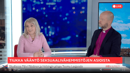 Viime viikolla kansanedustaja Päivi Räsänen (kd.) ja Helsingin evankelis-luterilainen piispa Teemu Laajasalo keskustelivat MTV:n Uutisaamussa Suomen evankelis-luterilaisen kirkon (tästedes ”kirkon”) suhteesta samaa sukupuolta olevien väliseen avioliittoon. Keskustelijat edustivat keskenään vastakkaisia kantoja: Räsänen (tunnetusti) vastustaa ja Laajasalo kannattaa.