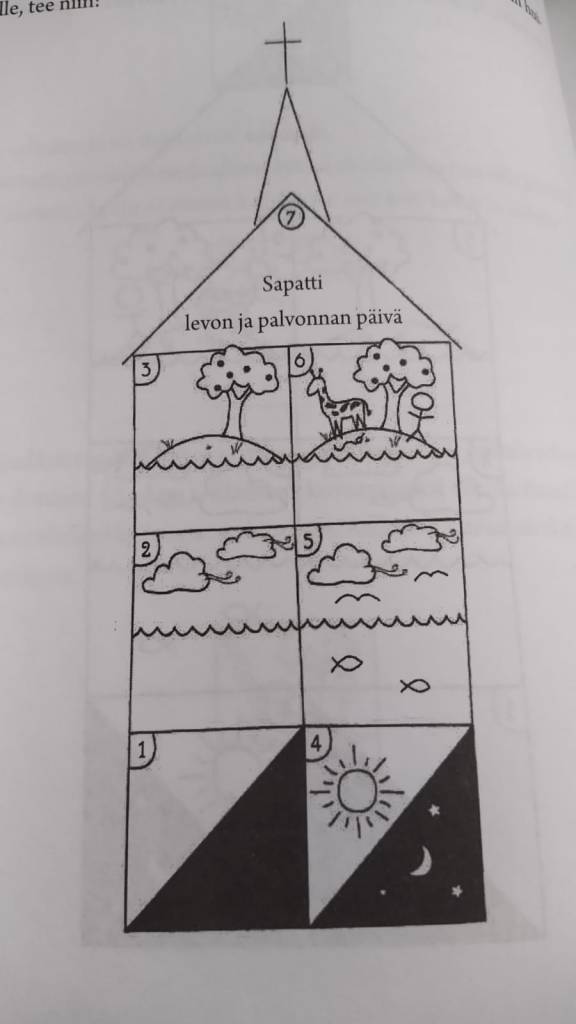 Bergsma painottaakin raamattuteologiassaan alusta loppuun liturgista visiota. Hyvä esimerkki on jo luomiskertomus, jonka käsittelyssä nykypäivänä usein juututaan luomispäivien kirjaimellisuuteen tai ei-kirjaimellisuuteen. Bergsma auttaa hauskan havainnollisilla piirroksillaan ymmärtämään luomiskertomuksen sisäisen logiikan: ensimmäisenä kolmena päivänä luodaan muodottomalle maailmankaikkeudelle muoto: aika (yö-päivä), tila (taivas ja meri) ja elinpaikka (kuiva maa ja sen kasvillisuus), ja seuraavina kolmena päivänä tyhjyys täytetään asukkailla: aurinko ja kuu (aika), linnut ja kalat (taivas ja meri), ja lopuksi eläimet ja ihminen (maan päälle). Luomistyön temppelin kruunaa ja pyhittää sapatti, levon ja liturgian päivä.