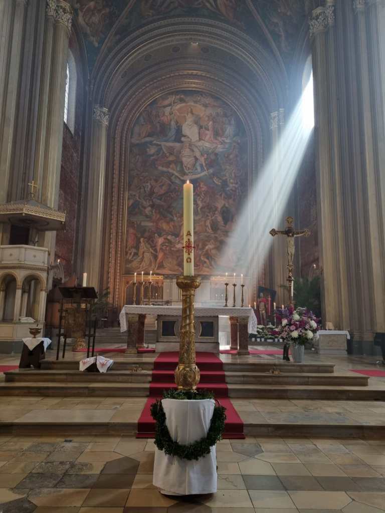Matkamme huipentui Baijerin pääkaupunkiin Müncheniin ja pääsiäisen viettoon siellä. Pääsiäisyön vigiliaan osallistuimme jättikokoisessa Frauenkirchenissä kardinaali Reinhard Marxin johdolla. Hän on kyllä parhaita saarnaajia, joita olen koskaan nähnyt, varsinkin piispakunnassa. Kirkkopoliittisesti Marx on viime aikoina profiloitunut kiistanalaisesti, mutta liturgiaa viettäessä ja saarnatessa näin hänessä ikään kuin nykyajan pyhän Ambrosiuksen, jonka luo aikamme etsivät augustinukset voisivat mennä oppimaan. Vigiliassa kastettiinkin viisi nuorta aikuista tähän ”toivon projektiin”, joka on kristinusko.