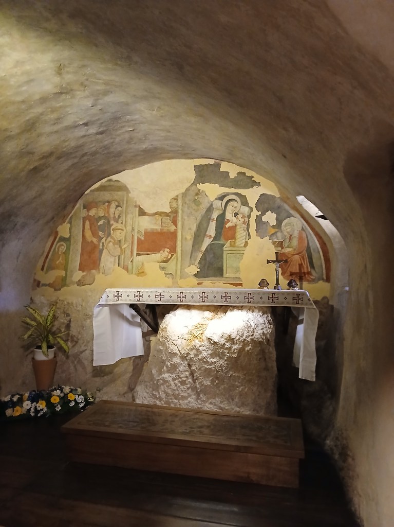 Yksi Italian-matkan vaikuttavimpia hetkiä oli nousu Greccion pyhäkköön pilvien yläpuolelle. Täällä vuorenrinteen luolassa pyhä Franciscus Assisilainen vietti jouluyön 801 vuotta sitten, vuonna 1223. Tuossa jouluyön messussa hänellä oli elävä seimi härkineen ja aaseineen, ja siitä alkoi levitä Italiassa ja koko Euroopassa niin rakas jouluseimiperinne. Luolan takana oli 1200-luvulta säilyneet pyhän Bonaventuran ja muiden fransiskaaniveljien yksinkertaiset huoneet.